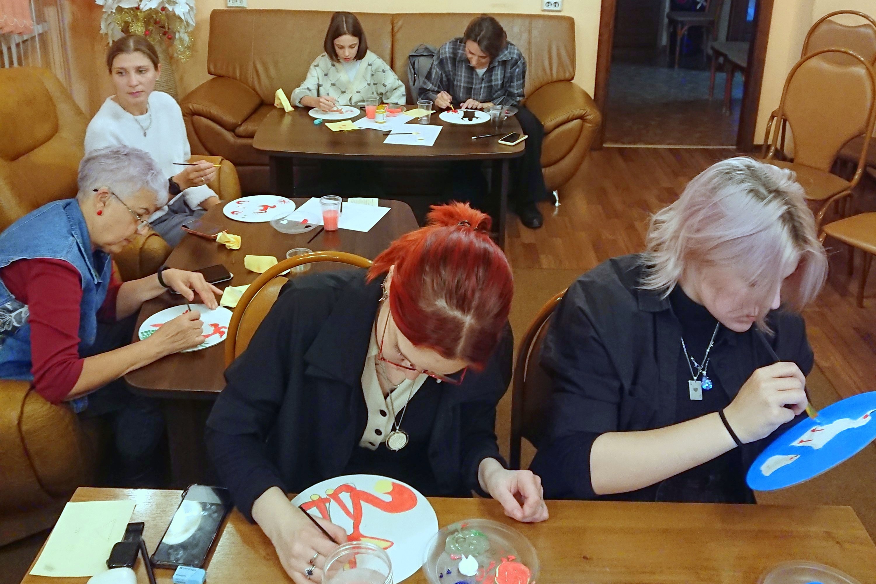 На этот раз собравшиеся вдохновлялись волшебством Гжели, Мезеня, восточноевропейскими фольклорными традициями. В начале работы участники выполнили несколько эскизов, зарисовок, элементов традиционных росписей, а затем приступили к работе на холсте. Выбрав главным героем своей картины птиц, животных, цветы, насекомых, сказочных героев, создали собственные произведения и ушли радостные и с чудесным настроением!