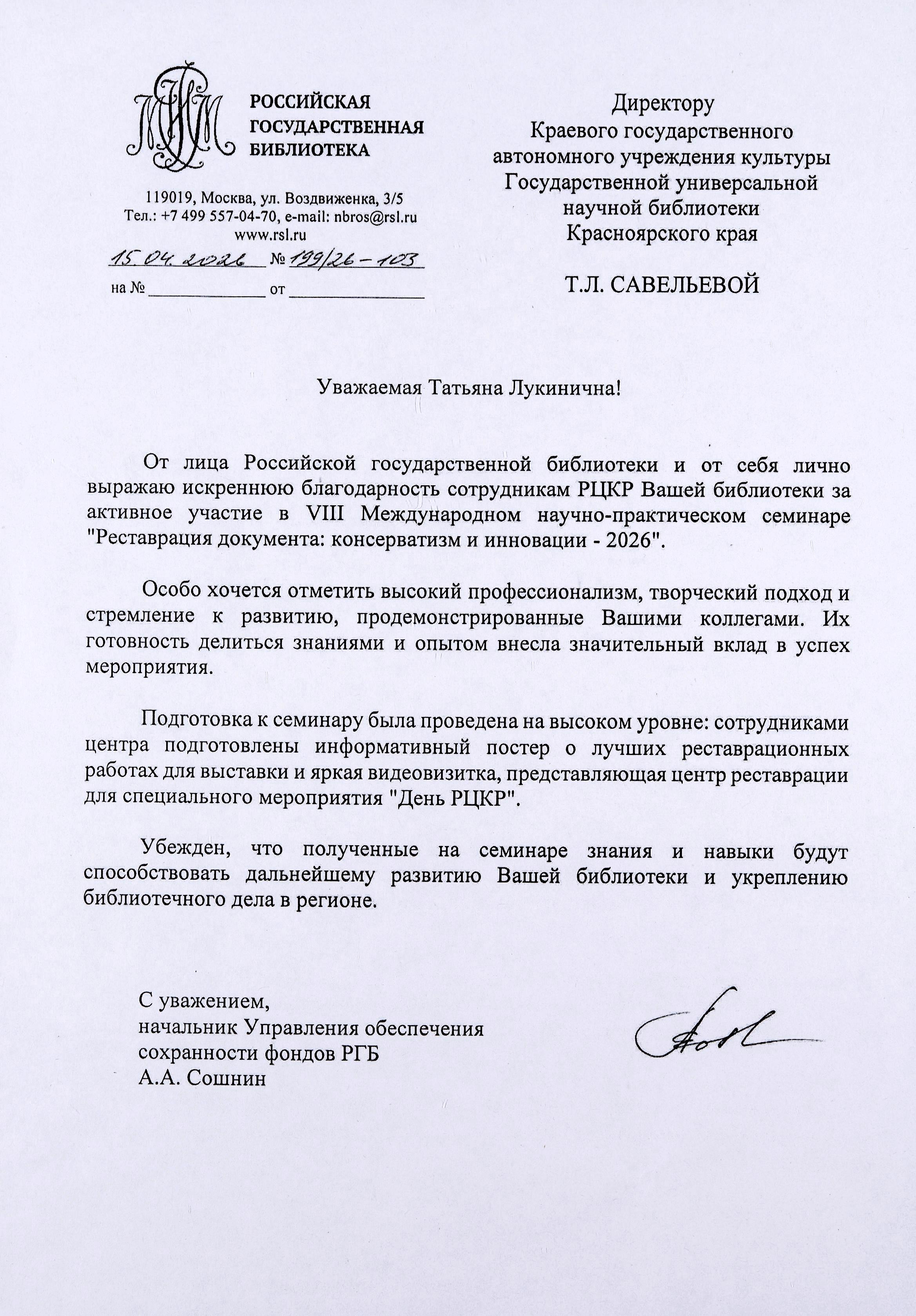 Благодарность начальника Управления обеспечения сохранности фондов РГБ сотрудникам Регионального центра консервации и реставрации за активное участие в VIII Международном научно-практическом семинаре «Реставрация документа: консерватизм и инновации – 2026»