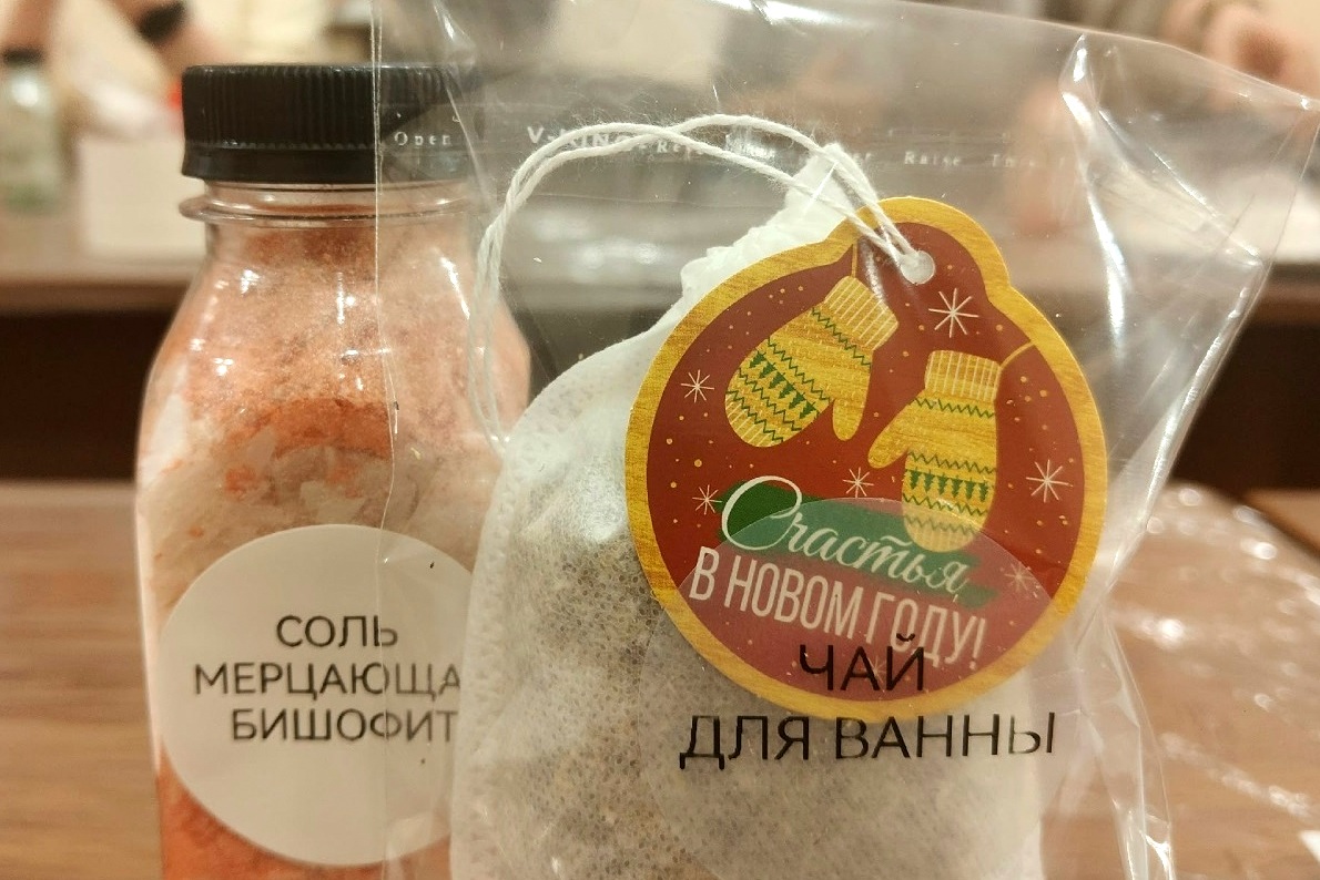На мастер-классе «Новогодние россыпи» участники познакомились с банными традициями сибиряков и создали ароматные подарки для ванны из магниевой соли, трав и отдушек хвои и мандарина.