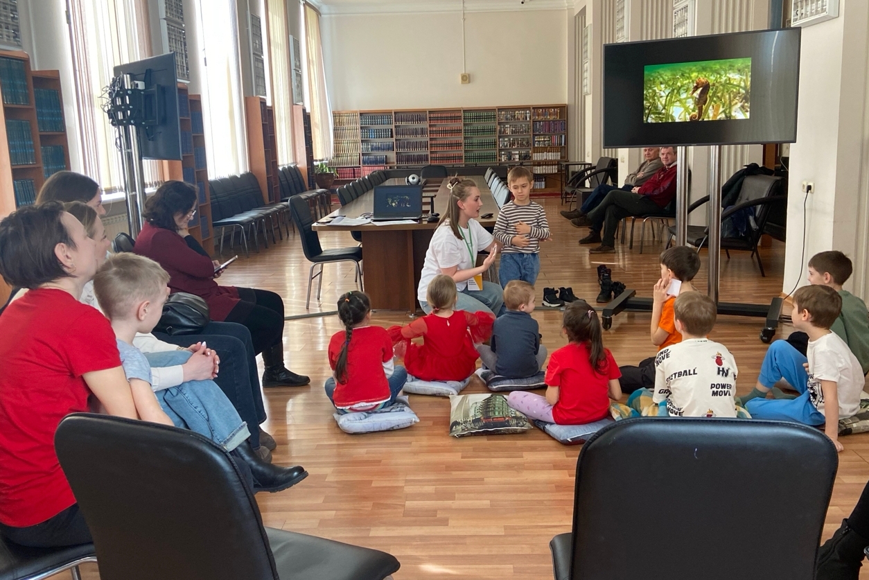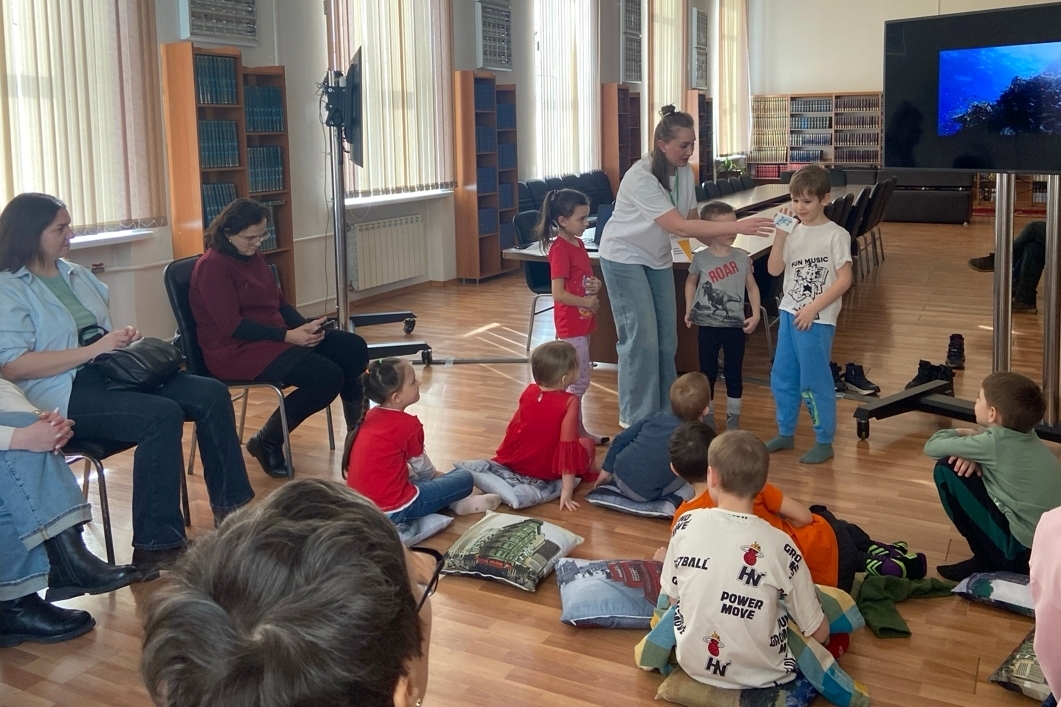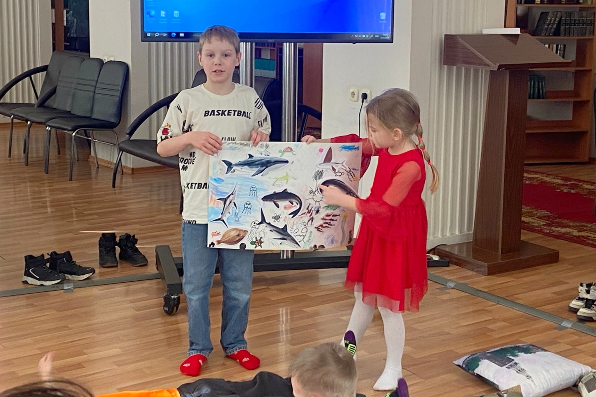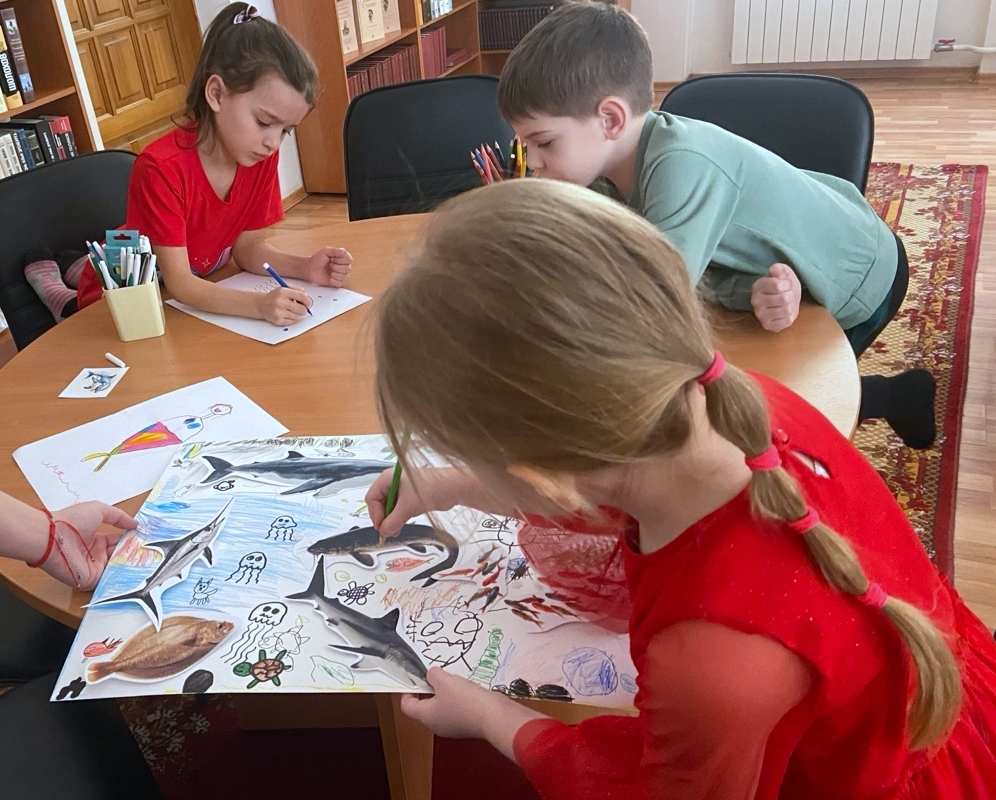 Устроившись на мягких подушках, дети внимательно слушали рассказчика. Волшебство продолжилось в играх: ребята с удовольствием отвечали на вопросы по сказке, разгадывали загадки, изображали героев с помощью мимики и движений, а остальные с азартом их угадывали. Вооружившись карандашами, ребята перенесли кусочек океана в стены библиотеки. Эти задания не только развлекали, но и развивали коммуникативные навыки, внимание и сообразительность.
