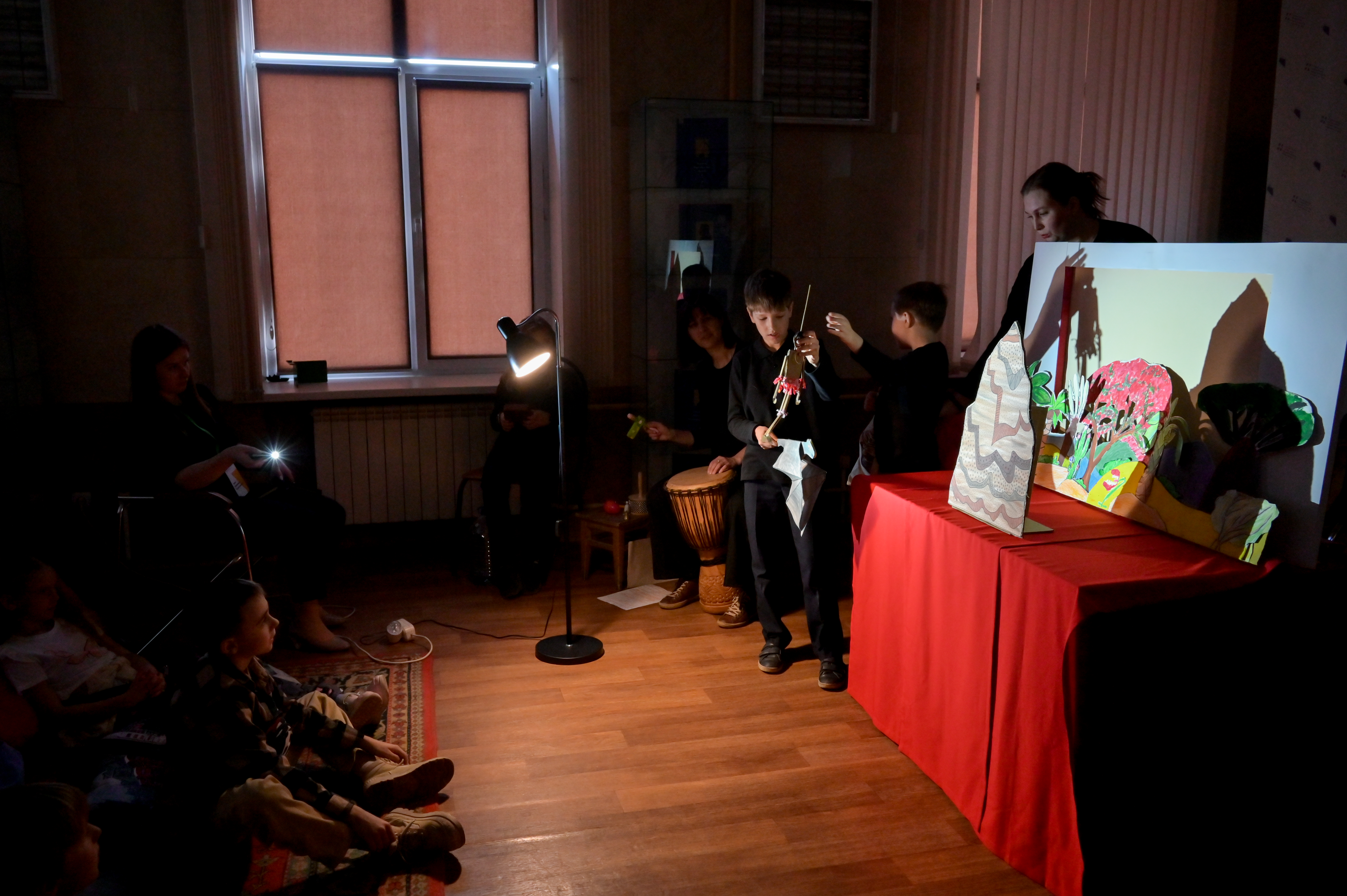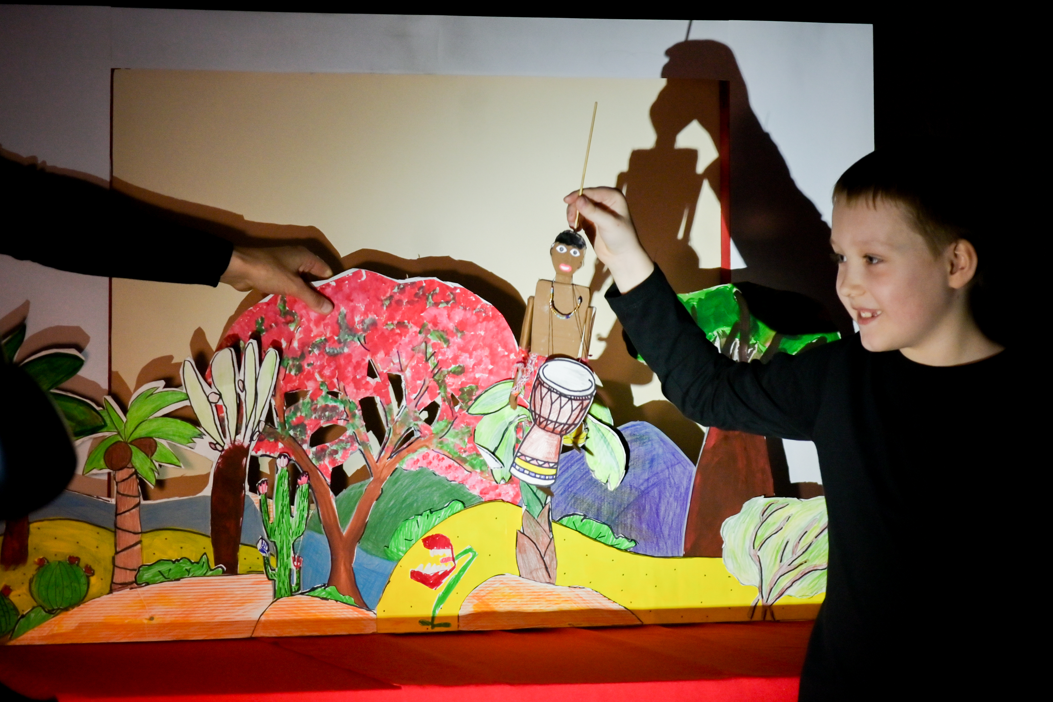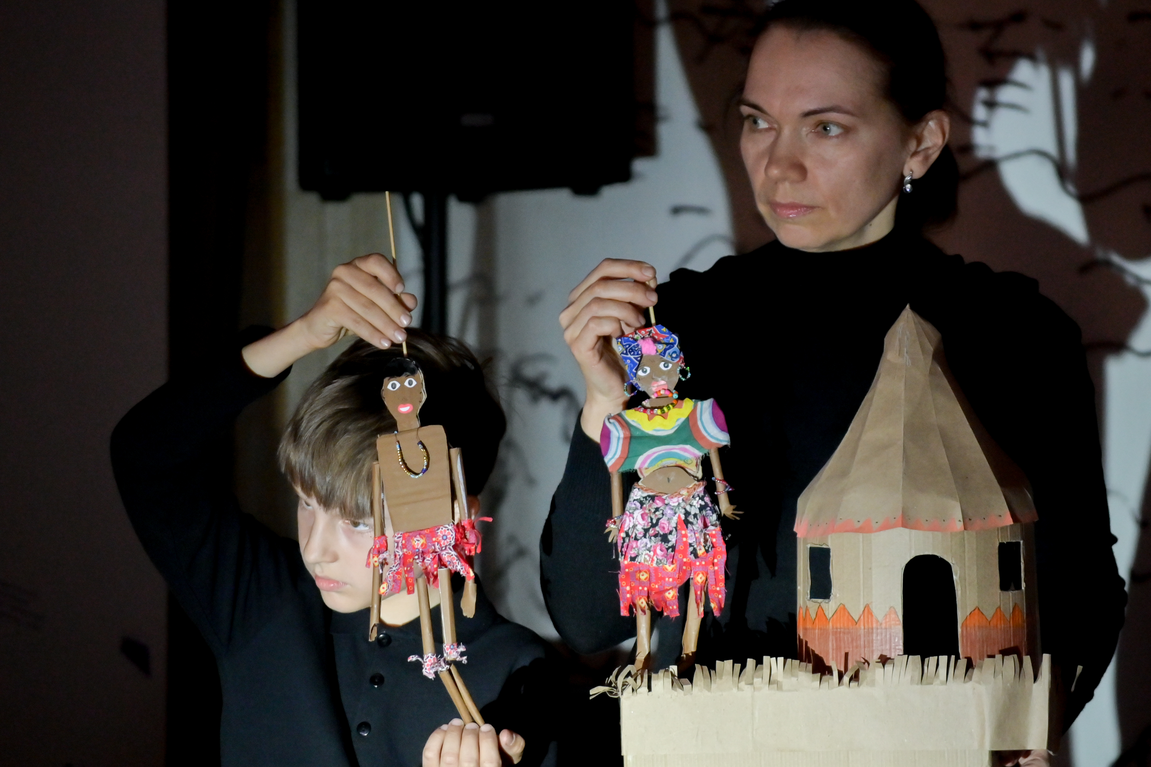 После спектакля можно было заглянуть за кулисы и увидеть, как создаётся магия при помощи тени, света и картонных фигурок. Ну и, конечно же, можно было поиграть на инструментах импровизированного театрального оркестра. Зрители могли убедиться в том, что в театре всё устроено достаточно просто, и они сами могут ставить такие семейные спектакли дома.