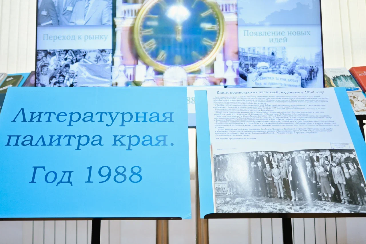 Презентация проходила в колонном зале, где была представлены выставка живописных работ художников, работавших в 1988 году, а также изданные в это время книги Красноярского книжного издательства. Собравшиеся увидели много исторических фотографий, кинохронику и фрагменты новостных передач 1988 года.